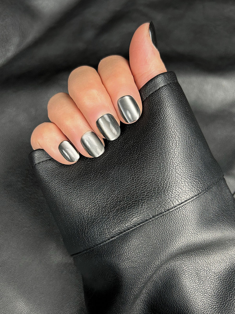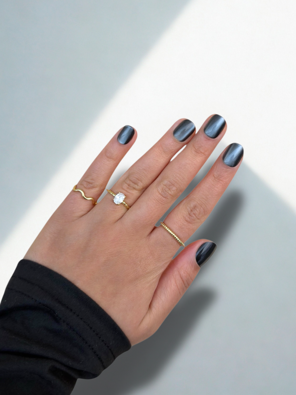 Full Moon Black Cat Eye is the deepest, inkiest black you’ve ever seen, until light hits. Then a razor-sharp silver-white magnetic beam slices across each nail like moonlight cutting through the dark. The cat-eye line glows and floats with every move, giving you that straight-out-of-a-witchy-dream effect.